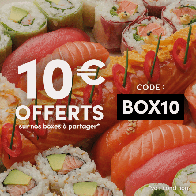 Conditions : 10€ offerts pour l'achat d'une box à partager (box for two gourmet, box for two, blackbox gourmet, blackbox classic, box by you, box Salmon addict, box Le Petit Prince®) à emporter, Click&Collect, livraison et sur place du 26/02/26 au 01/03/26 inclus dans les Sushi Shop participants. Valable une seule fois par personne et non cumulable avec d’autres offres et promotions en cours. Non valable sur la Amazing Sunday Box