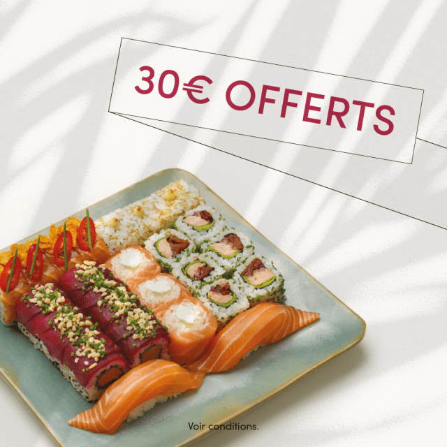 Modalités : 3x10€ offerts dès 40€ d'achat pour les commandes en livraison et Click&Collect uniquement, valable du 15/07 au 01/09 dans les Sushi Shop participants. Code valable 3 fois par personne et non cumulable avec d’autres offres et promotions en cours, hors Happy Sushi Box. Valable pour les clients ayant un compte fidélité Come In.*Montant calculé hors frais de gestion.