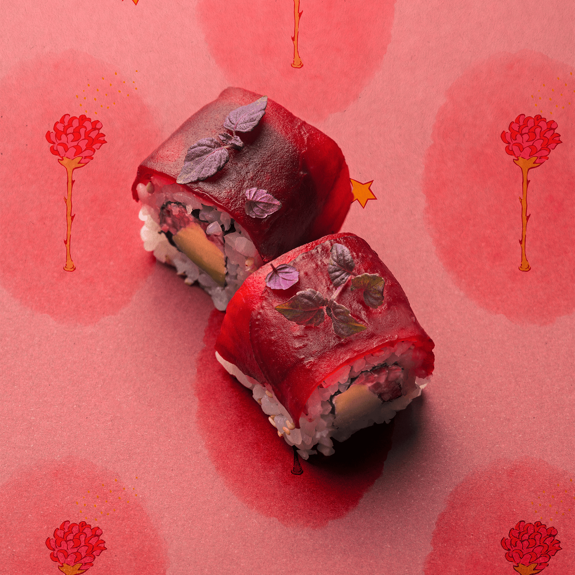 Als eerbetoon aan de kostbare roos van Le Petit Prince® combineert deze California de romigheid van roomkaas en avocado met de kleurrijke delicatesse van biet.