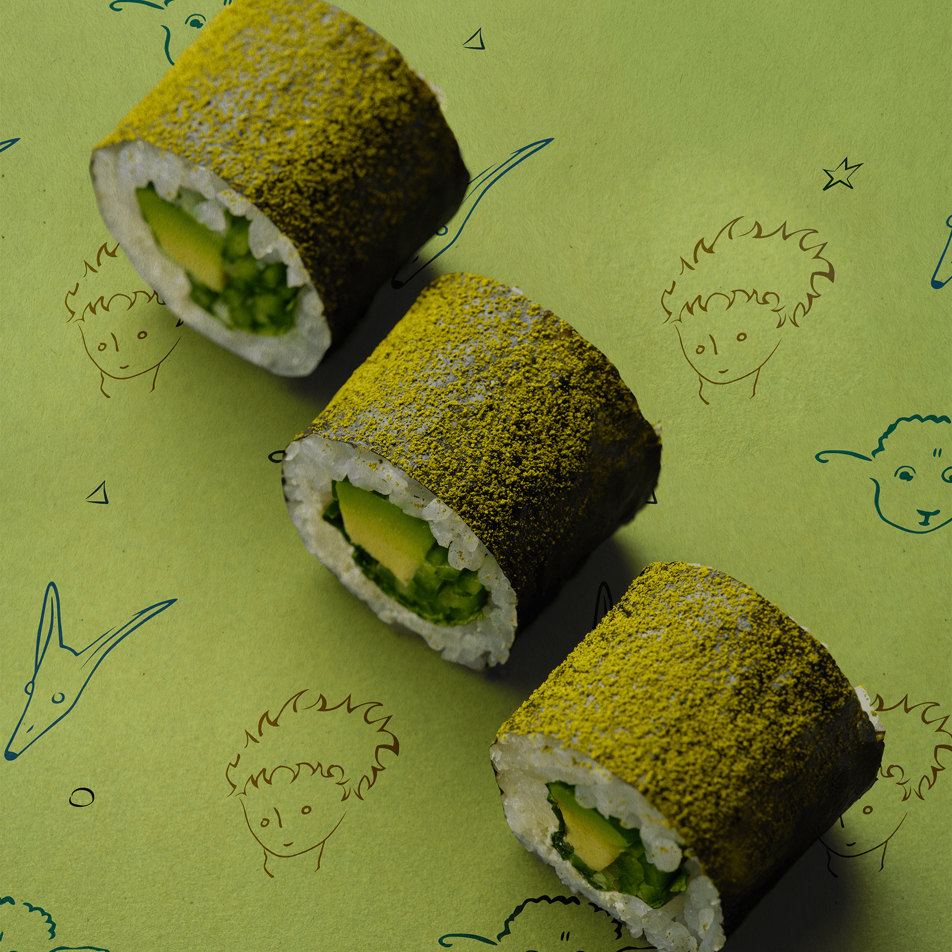 Met zijn groene matcha-coating doet deze maki denken aan de iconische outfit van Le Petit Prince®.